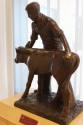 Label TextCommissioned along with "The Cornhusker" for the lobby of the Hotel Sheldon Munn in Ames, Iowa, "4-H Calf" is one of the most open forms that Christian Peterson ever produced. Its broad triangular shape and expressive physical characteristics give the work a liberated anecdotal quality. The sculpture most likely was inspired by scenes at the Iowa State Fair, where Petersen occasionally presented sculpting demonstrations. Obviously regional in subject, "4- H Calf" is one of the most compelling indicators that Petersen was one of few three-dimensional artists who embraced the regionalist movement. The 4-H Calf was inspired by, and is a tribute to, Iowa’s youth who learn and labor on farms. Here, an adolescent farm boy, is studiously positioning his calf for judging at the Fair. Norma "Duffy" Lyon continued the tradition of sculptural demonstrations at the Iowa State Fair, and was famous for her butter cows. Mrs. Lyon was a student of Christian Petersen. This sculpture was cast posthumously in bronze in 2003 from the 1941 original plaster model.