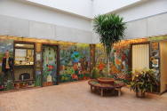-------------------------------------------------------------------------------------------------------------------The atrium of Horticulture Hall surrounds the viewer in a vividly colored mural showcasing the impact of horticulture at Iowa State University. The eight foot high panels flow together uniting the design among doors, nooks, and crannies. Based on artist Sarah Grant’s love of storytelling, the mural depicts the lives of those who had significant roles in horticulture research, teaching, plant development, propagation, and turf management at Iowa State. Notable names and faces represented along with their horticulture contributions include Spencer Beach, Griffth Buck, J.L. Budd, Charles Hall, George Washington Carver, Louis Pammel, and A.E. Cott. Interspersed on the panels are painted flowers, fruits, vegetables and ornamentals developed by these horticulturalists. Sticks, Inc.’s signature wood burned text enhances the stories of these pioneer scientists. The mural has an immediate impact on the viewer as they enter Horticulture Hall.