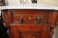 The walnut and burl wood bedroom set in the Farm House’s collection is in the dramatic Renaissance Revival style popular from 1850 to 1890. This style of furnishing employs eclectic motifs such as flowers, fruit, cartouches, medallions, contoured panels, urns, scrolls, busts, and animal heads, as well as architectural elements such as pediments, columns, and balusters. The Renaissance Revival styles of the 1860s and 1870s marked the first period in which fine designs were used for mass-produced furniture.