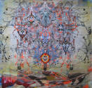On viewLabel TextThe bright, patterned paintings that Susan Chrysler White creates recall the Op Art movement of the 1960s. Abstract imagery and patterns morph into forms that are "botanical, insect-like or mutations of some hybrid futuristic organism". Susan does not use brushes to make her paintings but instead pours and presses paint onto the canvas and paper.