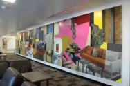 Located in the lobby of Geoffroy Hall, Mickalene Thomas’ Untitled is meant to draw nostalgia and a sense of belonging to the viewer inhabiting the large campus dormitory. The large mural spans a collaborative workspace for students often used as a study area. The mural depicts five colorful living rooms, each with patterns and furniture inspired by Thomas’ childhood in the 1970s. The artist worked to create interiors that could connect with students from diverse backgrounds and draw their attention with bright colors, rhinestones, and mirrored surfaces.