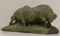 Buffalo have long symbolized the spirit of the American frontier, becoming enduring icons in American art. In 1913, American sculptor and medallic artist James Earle Fraser (1876–1953), a contemporary of Petersen, designed the Buffalo Nickel. A student of renowned sculptor Augustus Saint-Gaudens, Fraser created a five-cent coin featuring a Native American profile on the front and a buffalo on the reverse, in circulation from 1913 to 1938. Growing up in the Midwest, Fraser was deeply influenced by his early experiences, later reflected in both his coin design and his sculpture The End of the Trail (1894), also featured in the University Museums’ collection. In a 1911 letter to the U.S. Mint, he wrote, “The idea of the Indian and the buffalo on the same coin is, without doubt, purely American and seems to be singularly appropriate to have on one of our national coins.” In the 19th and early 20th century, American artists played a significant role in drawing attention to the dramatic decline of the buffalo population, documenting its impact on the lives of Native Americans, and advocating for conservation efforts.