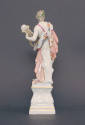 These figures are a reflection of the rococo style with a gentle meandering of form and a graceful asymmetry. Mythological figures were produced throughout the history of Meissen, largely influenced by the widespread popularity of classical engravings. Favorite subjects included Minerva, the Roman goddess of wisdom and war, and Apollo, god of sunlight, prophecy, music and poetry. Visual clues to each deity’s identity include the horned owl looking up from Minerva’s side and harp placidly strummed by Apollo. Made by Eberlein between 1741 and 1747 as part of a series largely based on mythology, these figures are excellent examples of sculpted hard paste porcelain.