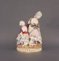 These figures typify Acier’s style of combining neoclassical ideas with moralizing and sentimentality. Acier was inclined to use harsher colors and more fret, or open, ornamentation than is seen in earlier Meissen sculpture. The practice of using earlier molds during the nineteenth century was precipitated by the rise of the middle class during the Victorian era. Porcelain, which became cheaper to make, was declining in popularity among the affluent. However, the middle class presented a new market to manufacturers. Porcelain became more affordable, and the overly dramatic and romantic eighteenth century molds suited Victorian tastes.