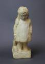 The sculpture pair Two Children, created by Christian Petersen in 1939, features individual 12 in. figures of a young boy and girl, each about three to four years old. Sculpted in clay, one depicts Petersen’s daughter, Mary, holding her rag doll with a dejected expression. The other figure portrays a neighborhood boy, her playmate, proudly holding a new puppy. According to Petersen’s wife, Charlotte, the boy had boasted about the puppy, telling Mary, “You can’t play with it,” highlighting a moment of childhood tension.