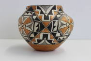 Label TextAcoma is a Keresan-speaking Pueblo that has been occupied from at least A.D 1200, making it one of the oldest continuously inhabited communities in the United States. Called the Sky City, it is built atop a mesa about 60 miles west of Albuquerque. Listed on the National Register of Historic Places, the breathtaking Pueblo offers a window into traditional life and is a top tourist destination in New Mexico. Acoma is especially known for its centuries-old tradition of making fine-walled polychromepottery featuring colorful geometric patterns. Pottery remains an important part of the culture and economy of Acoma today with many artists creating high quality, collectible pots using traditional techniques.
