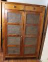 Label TextFrom the University Museums Collections Handbook, vol. 2, 2025: Pie safes like this one were essential kitchen furnishings in American households before the widespread use of ice chests or ice boxes. Carpenters specifically designed these cabinets to store and protect perishable food items such as bread, cured meats, flours, and baked goods. Their primary function was to keep food cool, dry, and free from insects, rodents, and mold, ensuring that goods remain fresh for as long as possible. Before modern refrigeration, homemakers faced a constant concern regarding proper food storage and the pie safe provided a practical and effective solution for families. The use of pie safes in America dates to the 1800s when German immigrants who settled in Pennsylvania introduced this traditional cabinet. These immigrants, commonly referred to as the “Pennsylvania Dutch,” brought with them an expertise in furniture-making, crafting durable and functional kitchen storage solutions that quickly became a staple in American homes. This pie safe is an example of traditional design. Made of sturdy pine wood, it features doors with punched tin panels for ventilation, allowing air to circulate and keeping the contents cool, while providing protection from pests. Carpenters typically elevated pie safes off the floor to further deter insects and rodents. The punched tin panels often served not only a functional purpose but also an aesthetic one—many decorated with intricate patterns. The tinwork on this example features star motifs, a common patriotic decorative choice.