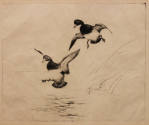 This large plate is cleanly wiped, and the ducks are executed in a rich drypoint. The landscape is only summarily indicated. There are pencil corrections on the lower ducks tail feathers. This print, one of a group of works called "Mr. and Mrs. Mallard" by Gordon Meany, shows that Darlings was working with the image of two landing ducks before he designed the "First Federal Duck Stamp." In fact, the reason that the duck stamp design looks the way it does was precisely because he had been doing prints like this one as well as others.