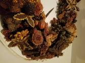 The Victorians love of nature encouraged women to include local flora and fauna in their domestic artistries. This seed wreath is a wonderful display of the Victorian ability to take discarded or found material and turn it into a decorative work of art. The wreath features various seeds and pods sewn together into floral shapes, with acorns, pine cones, and large nuts. These were likely found items sourced from the surrounding area, then cleaned and dried. The maker used wire to keep the individual elements together and sealed the final creation with a coat of varnish to protect and keep it pristine. Seed art was commonly used to decorate wreaths, baskets, frames, boxes, and more.