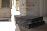 1) Three bronze pilasters, cast from altered and textured books; incorporated into vertical stucco walls of the niche. They are the primary focus of the installation. Located and Morrill Hall.