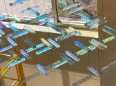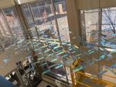 Light River is a light activated sculpture composed of suspended 1/16-inch stainless steel cables with dichroic glass bars connected at intervals along the cables. Dichroic is a definition for a thin-film coating that has the thickness of one-half of a wavelength of light -- thus it reflects one color and transmits its complimentary color. The overall form of the glass sculpture tapers to link to the geometry of the entry space and to expose the dichroic glass bars to the sunlight from the three south facing windows. The sunlight will trigger an explosion of reflected colored patterns up and onto the complex geometry of the landing and walls to the north as well as project colored patterns onto the floor and walls in its vicinity. The 1/16-inch cables are hung in a 6 X 6 inch grid suspended from the ceiling close to the three southern windows. The glass bars are made of three laminated layers of glass, with a range of four (magenta, blue, yellow, and cyan) different dichroic colors. These colors will change with the angle of light as well as the mix of projecting and reflecting light. Although there are four dichroic colors, each color will always appear different as one views the sculpture. This is because the view from a person's eyes will be at a slightly different angle for each glass element. The piece measures approximately 32 feet long X 4 feet high X 6 feet wide and consists of 272 cable sections that contain 441 dichroic glass bars 10 X 1 1/2 inches. This is a work of art that comes alive in the sunlight and will also become animated with electric lights at night. Light has always represented health, goodness, and purity. These colors are created from pure (non-pigmented) light. It is my true hope that this project will add to the healing properties of the Student Health Center.