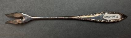 Label TextThe snail fork is approximately 4½ inches in overall length, a small fork made with two long, pointed tines. In formal dining, snails are prepared without shells and served on a snail dish made with indentations to hold the buttery sauce and the meat is eaten with a snail fork. In informal dining, snails are usually served in shells. The diner steadies the shell with metal tongs or a napkin-covered hand, and extracts the meat with a snail fork held in the other hand.